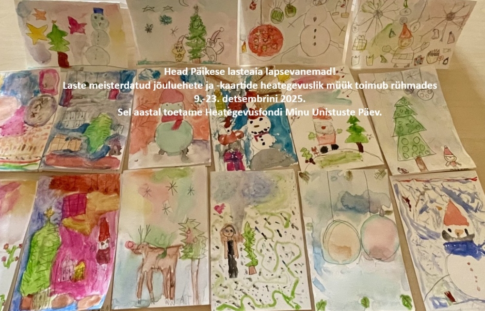 Laste meisterdatud jõuluehete ja -kaartide heategevuslik müük toimub rühmades 9.-23. detsembrini 2025. Sel aastal toetame hoolekogu ettepanekul Heategevusfondi Minu Unistuste Päev.